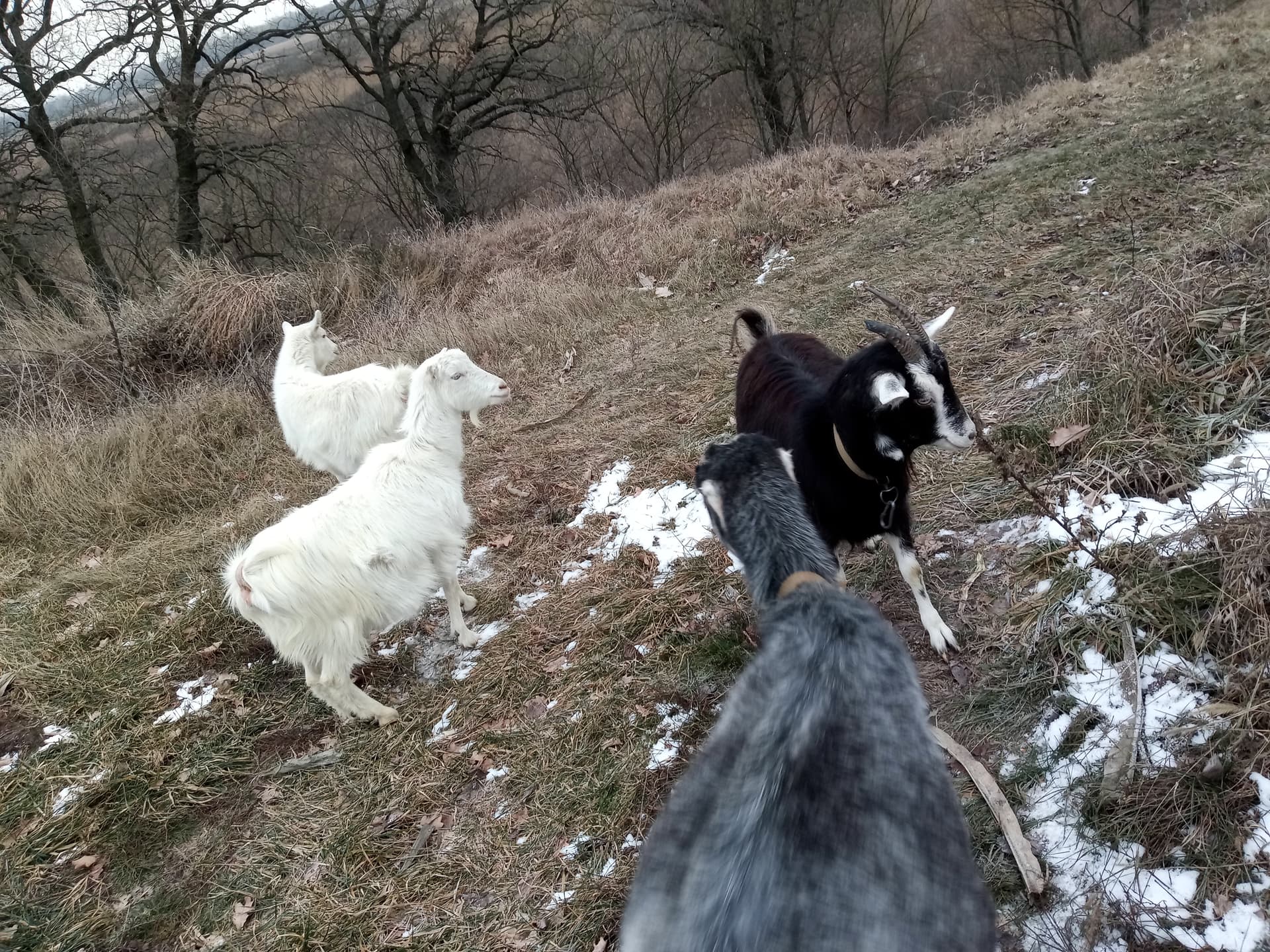 Знакомьтесь, серенькая милка-козочка постарше, черненькая-катька и беленькая без ушек-ромашка(первокоточки),а беленькая с ушками красуня козоребенок,чуть с ног не сбила.