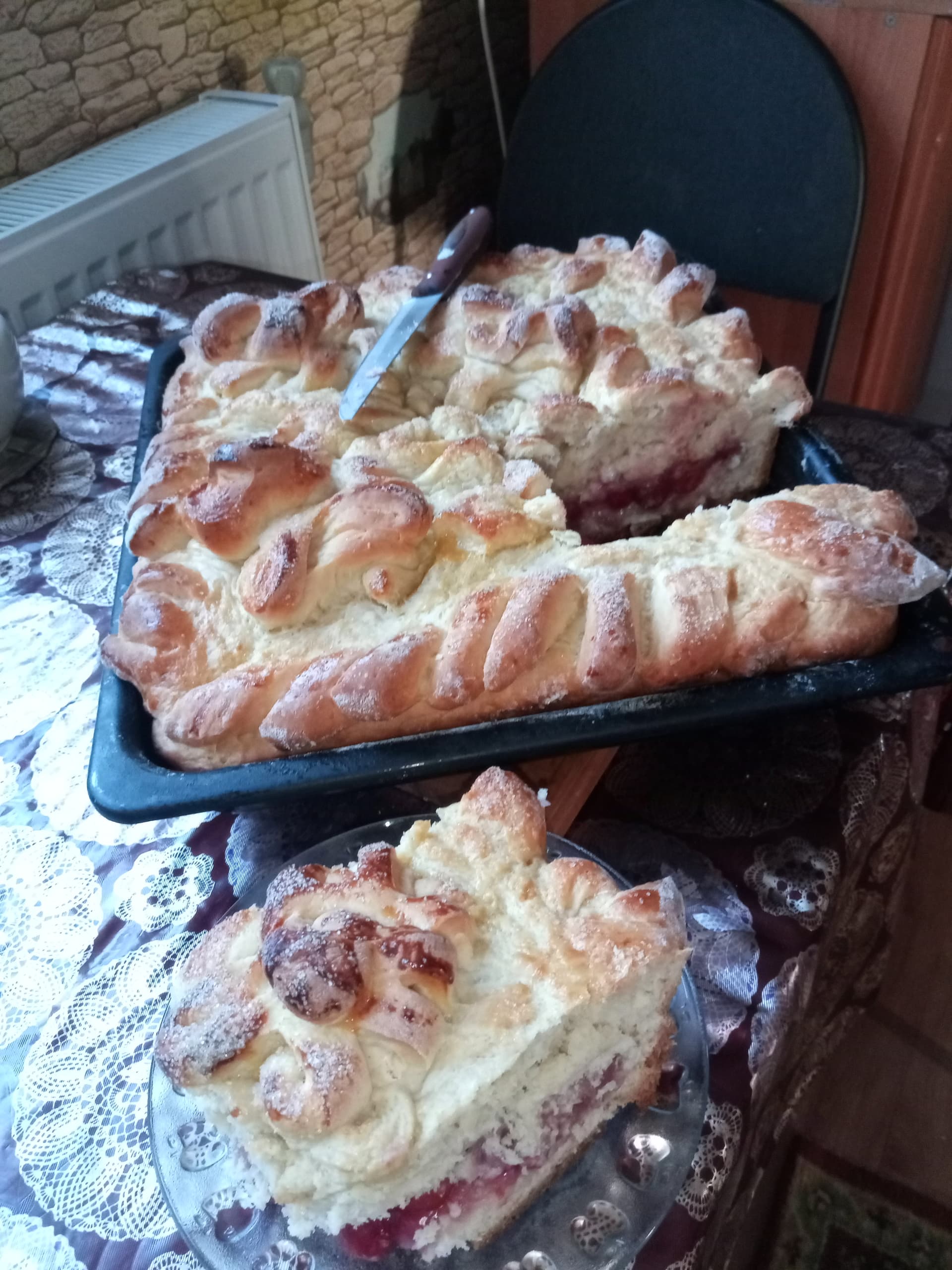 Ой как давно не была у себя в домике, все по гостям да по чужим домикам прыгаю ,Можна сказать опыта набираюсь и положительных эмоций. Вчера в срочном порядке пришлось готовить по форумскому рецепту молочный пудинг,но у нас наверное более привычный а-ля молочный кисель😁так-как кукурузного крохмала дома не нашлось ,а слюни то текут и мы по своему заменили картофельным крохмалом,сделали густой, а верх полили клубничным вареньем, нямочка😍. Ну и как не крути без молока и булки у нас голодовка. Сегодняшнее наше творение пирог или почти плюшка но с мороженой вишней.надо же себя любимых зимой баловать.