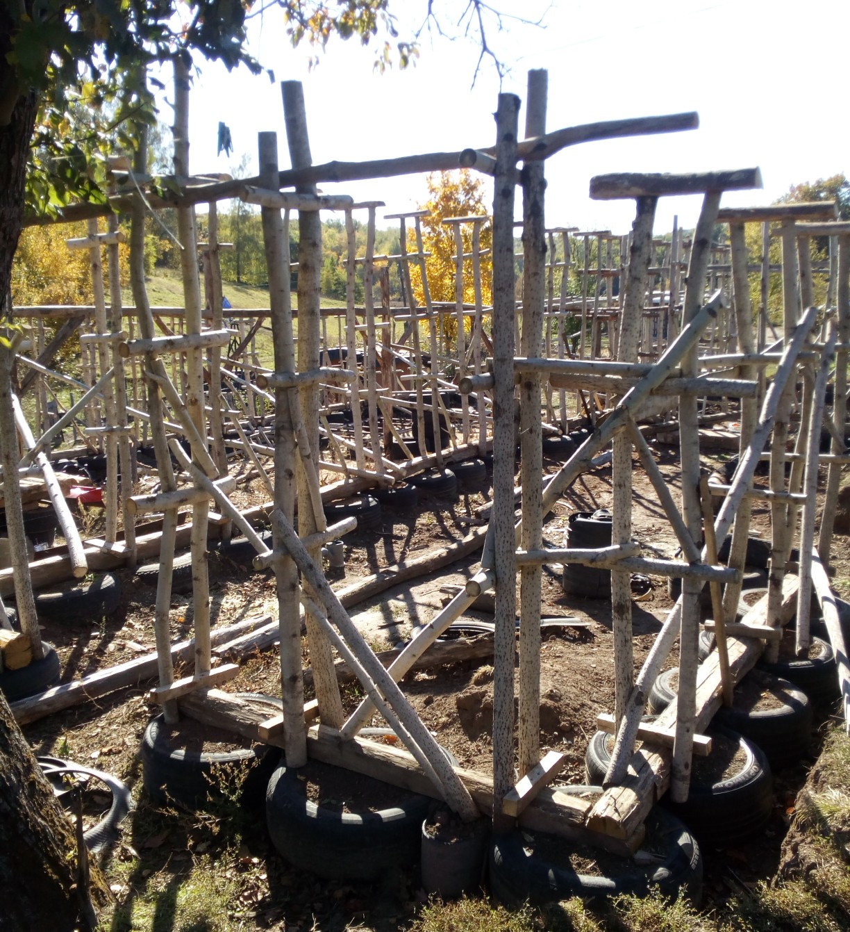 Валипини (2015-2016г.г. строительства) - “тёплое место” - теплица + помещение для животных.Основные материалы: мешки полипропиленовые, грунт, саман, дерево, прозрачный шифер, очерет.