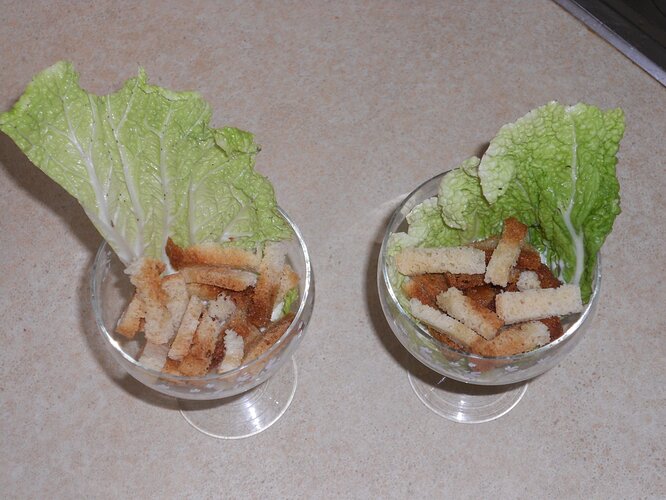 Первый слой салата – сухарики. Можно купить в магазине (желательно выбирать не ярко выраженный вкус) или как я приготовить самостоятельно. Для того чтобы приготовить сухарики я тонко нарезаю белый хлеб, выкладываю одним слоем на тарелочку, посыпаю солью и итальянскими травами и отправляю на несколько минут в микроволновку пока они не подсохнут. небольшое количество сухариков выкладываем на дно бокала и немного смазываем соусом.