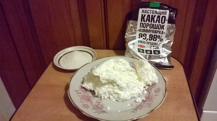 Так от берем 300 гр сиру, 3ст.л. цукру, 2ст.л какао, ванілі на кінчику ножа.