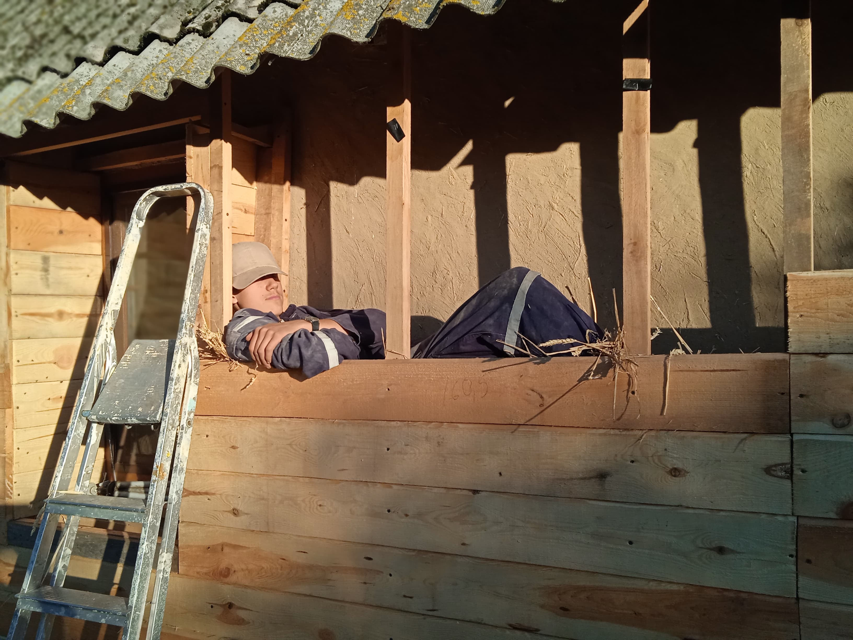 Итак, вокруг дома подлили фундамент и выставили конструкцию из реек. Далее мы по рейкам дом зашили доской, а промежуток между глиняной стеной и досками затрамбовали… (тут у слабонервных случается обморок) – соломой! Та-дам! Все. Можно кидаться тапками. Ох, стращали нас, в слабоумии обвиняя, мол, каааак позалезают к вам мыши, да кааак наделают вам там… не-а. не залезли. Ну, некак. Мы же тоже не маленькие. Бетонный фундамент к дощатому щитку снизу прилегает вплотную, щели между досками в миллиметр, то же сверху. На всякий случай солому внутри стены обильно пересыпали ядом. У нас ушло в толщу стен 12 (!) большущих квадратных тюков соломы по 200 (кажется) кг. Если пересчитать плотность – там не то что мышь, соломину лишнюю впихнуть сложно. Трамбовал все как самая утонченная и весомая личность Никола собственной персоной.